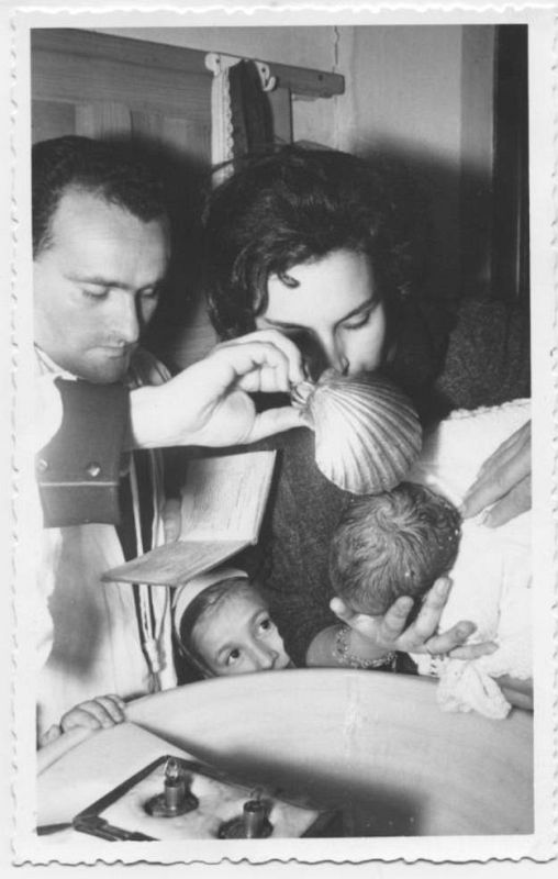 En esta foto, enviada por María Jesús, vemos el bautizo de su hermano Juanjo, en 1961. Mientras la madre, María Jesús, sostiene al pequeño, una jovencísima María Jesús asoma la cabeza por debajo de la pila.
