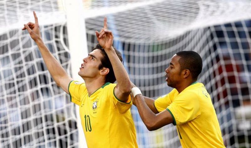 15.06.2009Kaká celebra con su compañero"Robinho", el gol que ha marcado a la selección de Egipto.EFE -