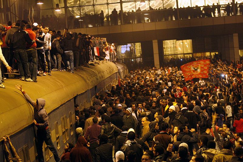02.02.2012Egyptians wait at Cairo's train station on February 2, 2012 for the train carrying fans of al-Ahly club who were injured in the previous day's deadly riots after a football match. Egypt began three days of mourning after 74 people were killed in an eruption of violence at a football match that sparked new anger against the military rulers for failing to ensure security. AFP PHOTO/STRkd/BEH