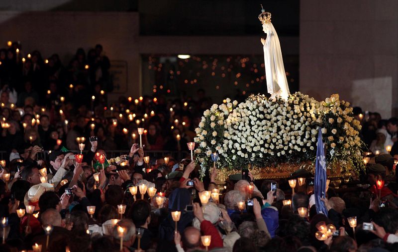 13.05.2010AC08. FÁTIMA (PORTUGAL), 12/05/2010.- Detalle de la virgen de Nuestra Señora de Fátima hoy, miércoles 12 de mayo de 2010, en la tradicional procesión de las velas en el Santuario de Fátima (Portugal), donde el papa Benedicto XVI afirmó que la humanidad "sufre y está herida" y que la fe corre el riesgo de apagarse en muchas partes del mundo. El pontífice se encuentra en una visita de cuatro días para presidir la celebración conmemoración anual de la aparición de Nuestra Señora a tres pequeño pastores el 13 de mayo de 1917. EFE/ANTONIO COTRIMEFE/ANTONIO COTRIM