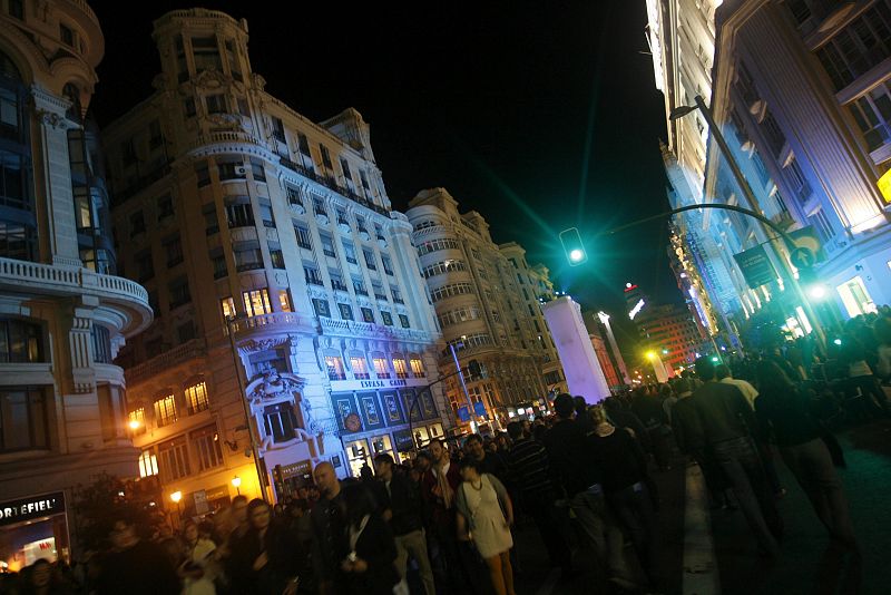 20.09.2009MD66. MADRID, 19/09/09.- Iluminación de la Gran Vía madrileña en la cuarta edición de La Noche en Blanco, una fiesta de la cultura en la que se ofrece a los ciudadanos de Madrid casi doscientas propuestas de ocio diferentes. EFE/Víctor Lerena.EFE/Víctor Lerena -