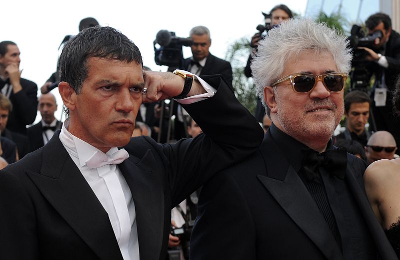 • El actor malagueño Antonio Banderas bromea con los fotógrafos en en la alfombra roja junto al director manchego Pedro Almodóvar.