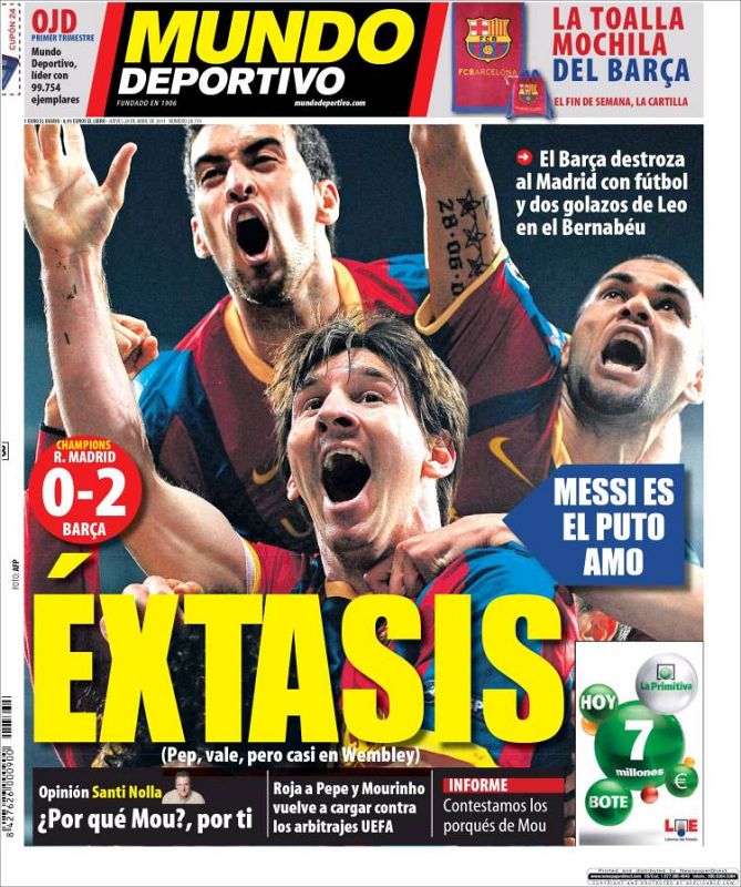 28.04.2011El diario deportivo editado en Barcelona, 'Mundo Deportivo', titula en su portada con la palabra "Éxtasis". La imagen muestra al goleador Messi celebrando el triunfo con Busquets y Alves.Mundo Deportivo