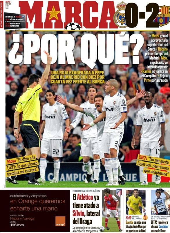 28.04.2011El diario deportivo editado en Madrid, 'Marca', se pregunta en su portada "¿Por qué?" ante lo ocurrido en el Santiago Bernabéu en el partido de ida de semifinales de la Champions entre el Real Madrid y el FC Barcelona. Los azulgrana vencieron por 0-2 y fue expulsado el madridista Pepe. El 'Marca' refreja las preguntas que se hacía Mourinho en la rueda de prensa posterior al partido. Además, el diario madrileño subtitula: "Una roja exagerada a Pepe deja al Madrid con diez por cuarta vez frente al Barça".Marca -