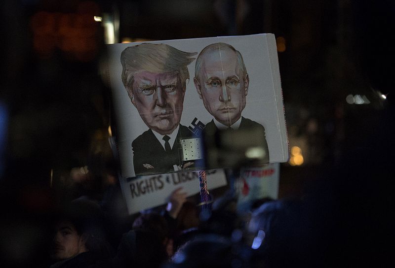 20.01.2017Imagen de una de las pancartas de la manifestación contra la investidura de Donald Trump en la que se ve al magnate junto al presidente de Rusia, Vladimir Putin.AFP PHOTO / Bryan R. Smith