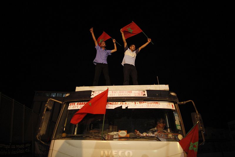 18.08.2010Moroccans from a Human Rights Association hold Moroccan flags on a truck during a protest in the border area which separates Spain from Morocco in Nador, northern Morocco August 17, 2010. Tensions between Morocco and Spain over immigration and disputed territories have flared into a row, straining ties that are crucial to European efforts to tackle terrorism and illegal migrants. REUTERS/Jon Nazca (MOROCCO - Tags: POLITICS SOCIETY CIVIL UNREST)REUTERS/Jon Nazca
