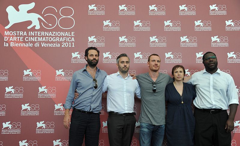 (From L) Producers Iain Canning, Emile Sherman, actor Michael Fassbender, screenwriter Abi Morgan and director Steve McQueen pose during the photocall of "Shame" at the 68th Venice Film Festival on September 4, 2011 at Venice Lido. "Shame" is competing for the Golden Lion in the Venezia 68 category. AFP PHOTO / ALBERTO PIZZOLI