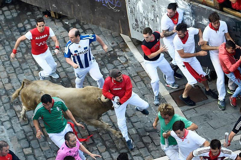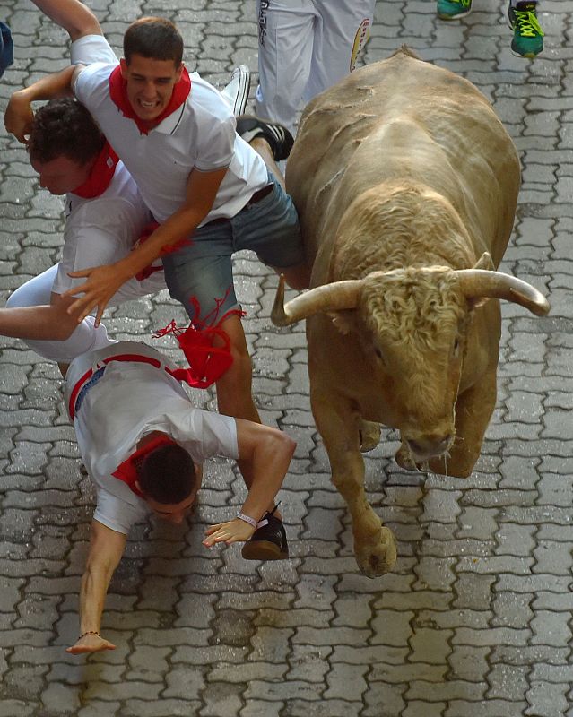 El toro Tramposo de Núñez del Cuvillo arrolla a tres corredores en el quinto encierro de los Sanfermines 2018. El ímpetu del animal de 535 kilos ha hecho trastabillarse a varios mozos.