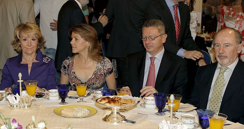 25.06.2010La presidenta de la Comunidad de Madrid, Esperanza Aguirre, junto a la secretaria general del PP, María Dolores de Cospedal, el alcalde de Madrid, Alberto Ruiz-Gallardón, y el presidente de Caja Madrid, Rodrigo Rato.EFE -
