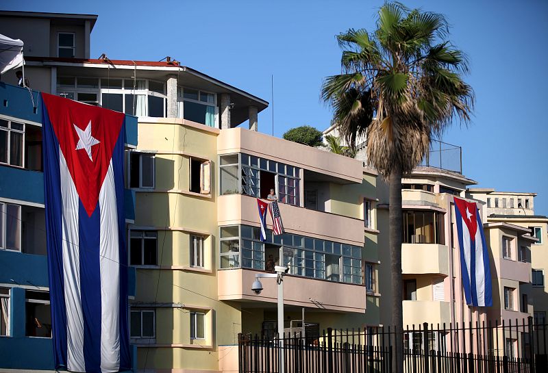 14.08.2015Edificios decorados con grandes banderas cubanas, y también con una de EE.UU., en los alrededores de la embajada.