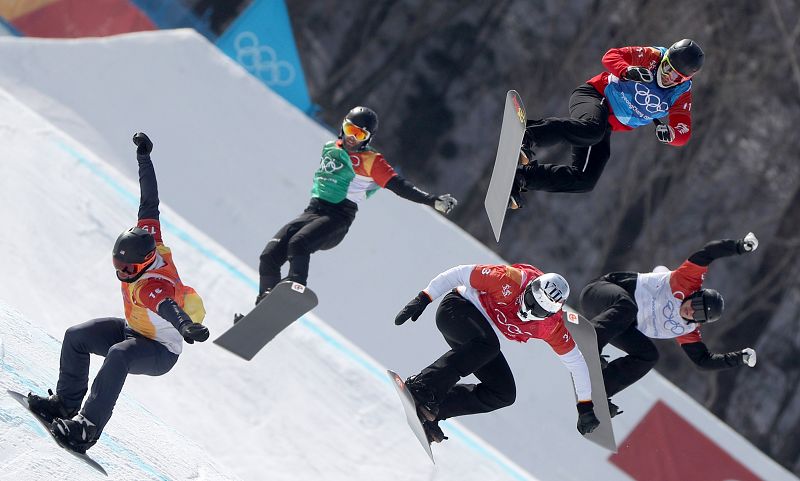 15.02.2018Regino Hernández, en el centro, en una de las cuatro rondas finales y eliminatorias disputadas en la prueba de snowboard cross de Pyoengchang.EFE/EPA/FAZRY ISMAIL