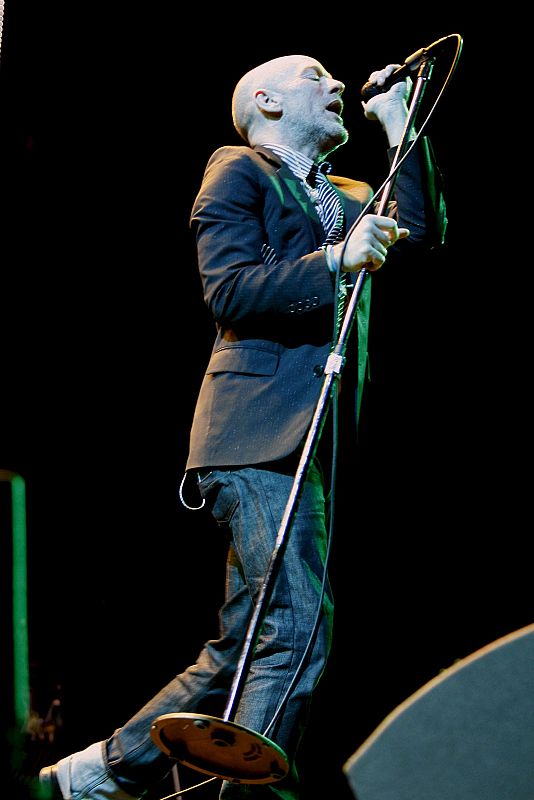 MUR07. MURCIA, 30/09/08.- El cantante del grupo norteamericano REM, Michael Stipe (d), y el bajista Mike Mills (i), durante el concierto que el trio de Athens (Georgia), ha ofrecido hoy en la plaza de toros de Murcia, dentro de la gira europea de presentación del su último album "Accelerate".