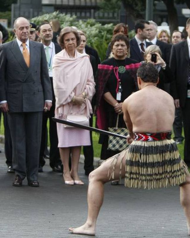 23.06.2009WE05 WELLINGTON (NUEVA ZELANDA) 22/06/09.- Los reyes de España, Juan Carlos y Sofía (c), junto a Rose White Tahuparaesu, disfrutan de un baile maorí durante la ceremonia de bienvenida a los reyes de España hoy en el Parlamento de Wellington. EFE/ J.J.GUILLENEFE/ J.J.GUILLEN -
