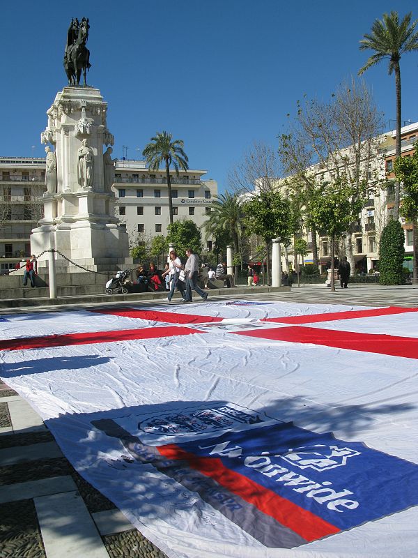 11.02.2009En la Plaza Nueva sevillana han desplegado una bandera gigante.MARÍA ACEVEDO -