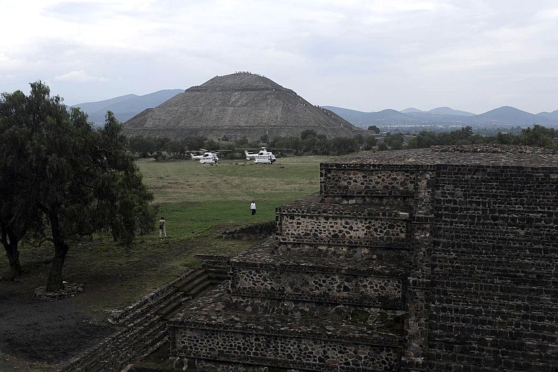 Helicopters carring Chilean President Sebastian Pinera and Mexican President Felipe Calderon prepare for take off at the archeological site of Teotihuacan in Mexico City on July 9, 2011. Pinera is on a four-day official visit to Mexico. AFP PHOTO/ Yuri CORTEZ