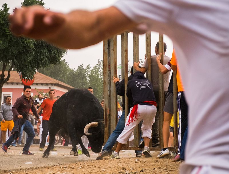 13.09.2016El toro embiste contra una valla mientras los mozos se esconden.AFP