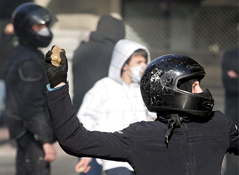 13.12.2008ATH04 ATENAS (GRECIA), 10.12.08.- Un joven lanza una piedra a policías antidisturbios durante los enfrentamientos que se produjeron en el centro de Atenas, Grecia, hoy miércoles 10 de diciembre, por cuarto día consecutivo tras la muerte de un joven de 15 años por un disparo de la Policía. Los disturbios de hoy se producen el mismo día en que está convocada una huelga general de 24 horas en todo el país en protesta contra la mala situación económica y en demanda de una mayor justicia social. EFE/Simela PantzartziEFE -