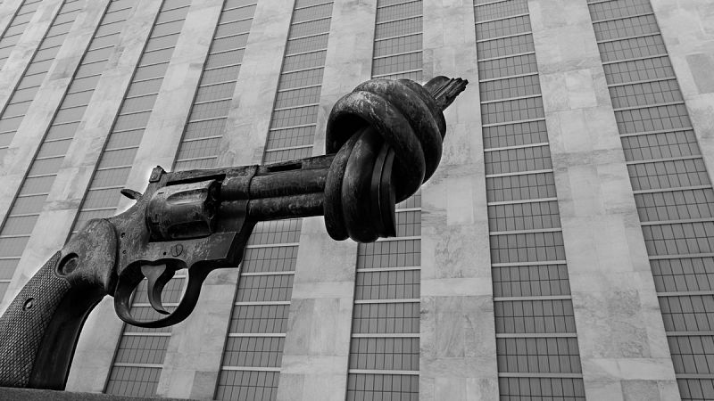 • Revólver anudado. Escultura de C.F. Reuterswärd en la puerta de acceso al edificio de la Asamblea General