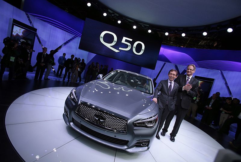 14.01.2013Shiro Nakamura, Chief Executive Officer for Infiniti, and Johan Nysschen, President of Infiniti, pose with the new Infinity Q50 luxury sports car at the 2013 North American International Auto Show in Detroit, Michigan, January 14, 2013. AFP PHOTO/Geoff RobinsAFP PHOTO/Geoff Robins