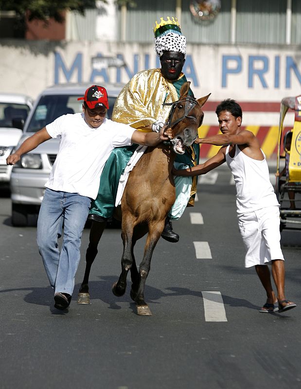 El rey Baltasar trata de avanzar por las calles de Manila durante la celebración de una cabalgata en la capital de Filipinas.
