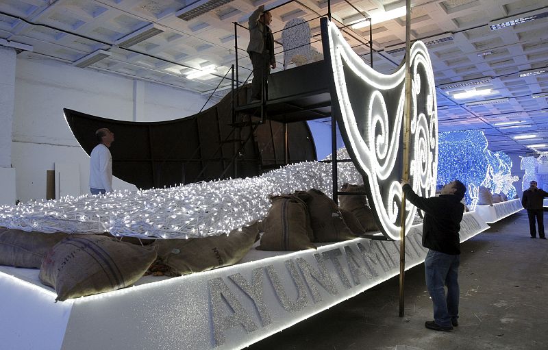 04.01.2010Varias de las carrozas que tomarán parte en la Cabalgata de Reyes de Madrid, y que aguardan en un pabellón del recinto ferial de la Casa de Campo a iniciar mañana su desfile por las calles de la ciudad. (04/01/10)EFE/Ángel Díaz