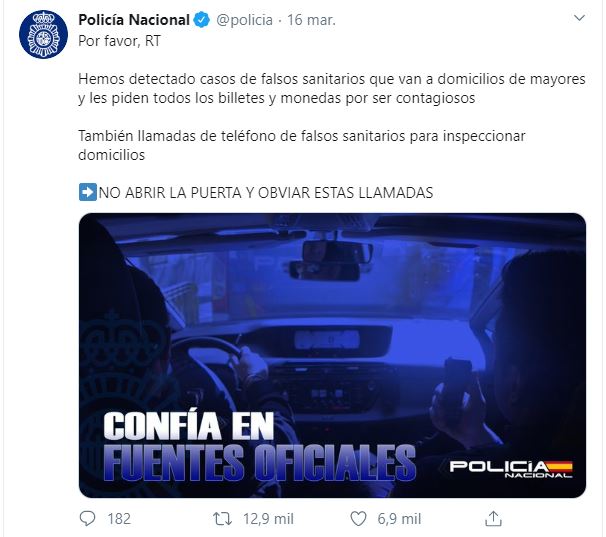 Varios audios de Whatsapp, uno grabado por una mujer llamada Eva y otro por un "vecino y policía" advierten que se están produciendo robos en los hogares realizados por falsos inspectores de sanidad. Las vías de contacto son presenciales o mediante una llamada previa y la excusa esgrimida es que van a cerciorarse de que se está realizando correctamente el confinamiento o solicitan todos los billetes y monedas que hay en la casa por estar contaminados. Verifica RTVE ha confirmado la existencia de este tipo de casos. La Policía Nacional ya ha advertido sobre esta situación y recomienda no abrir la puerta y obviar este tipo de llamadas. Ni Sanidad ni las fuerzas de seguridad están enviando a ningún tipo de personal hogar por hogar. Es una estafa. Aquí tienes el tuit de la policía si lo quieres compartir con personas a las que les pueda interesar.