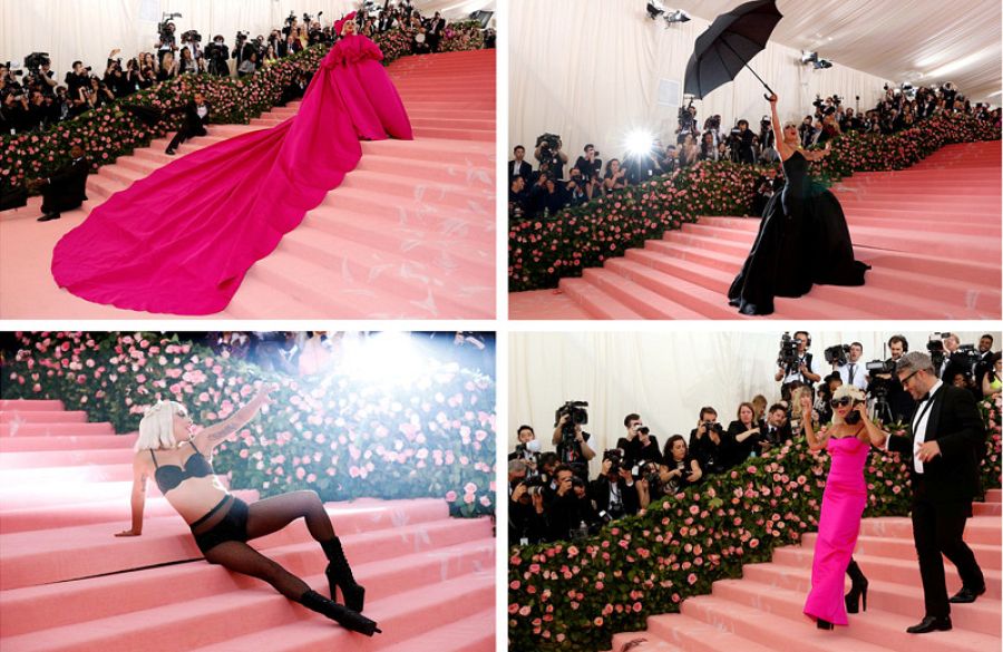 Para teatro, la obra de Lady Gaga. La actriz y cantante, ganadora de un Oscar a la mejor canción por Ha nacido una estrella, hizo una perfomance en las famosas escaleras del museo. Apareció con un voluminoso abrigo rosa que se quitó para lucir otro vestido distinto en color negro a juego con un paraguas, al más puro estilo Mary Poppins. Pero la función no terminó ahí y Gaga se quitó el vestido negro para dejar ver otro más ceñido en tono rosa que, para asombro de todos los presentes, no era el definitivo. La diva se desprendió de él y se quedó con un sofisticado conjunto lencero en tono negro con el que posó, gateó e hizo las delicias de los fotógrafos. Una idea del estilista y diseñador Brandon Maxwell.