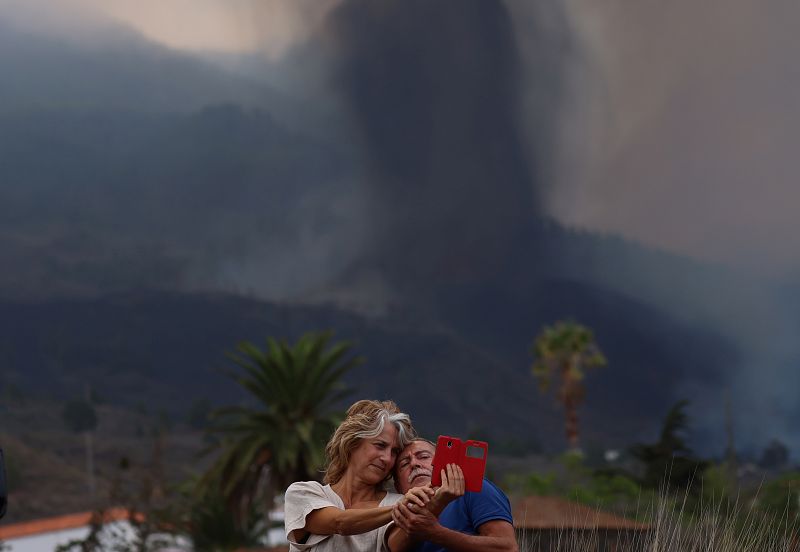 Una pareja se hace un selfie en frente de la erupción del volcán de La Palma