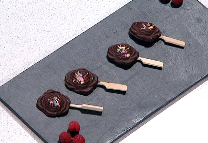 - Coloca una brocheta en un lateral con el chocolate aún derretido.