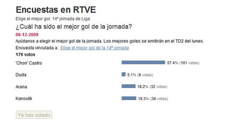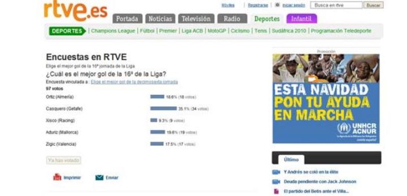- El tanto de Kanouté (20%) y el del racinguista Arana (18%), completan el podio