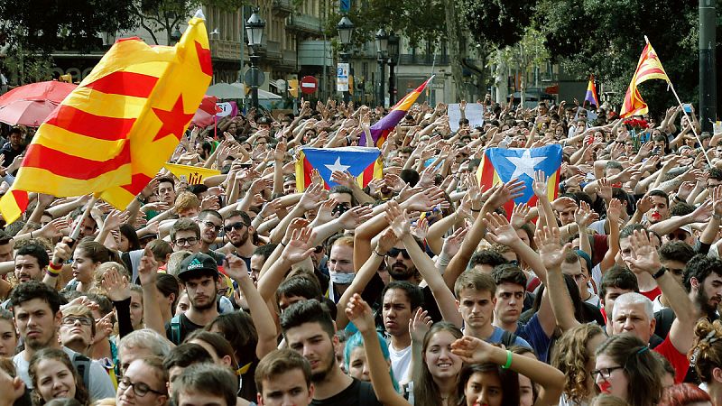 Los concentrados han recibido a las autoridades con aplausos y gritos de "Hemos votado", "Independencia", "No tenemos miedo" o "Somos gente pacífica, sólo queríamos votar". La manifestación en defensa de la votación de este domingo y contra las cargas policiales ha continuado después en la plaza Catalunya, donde se han congregado miles de personas.