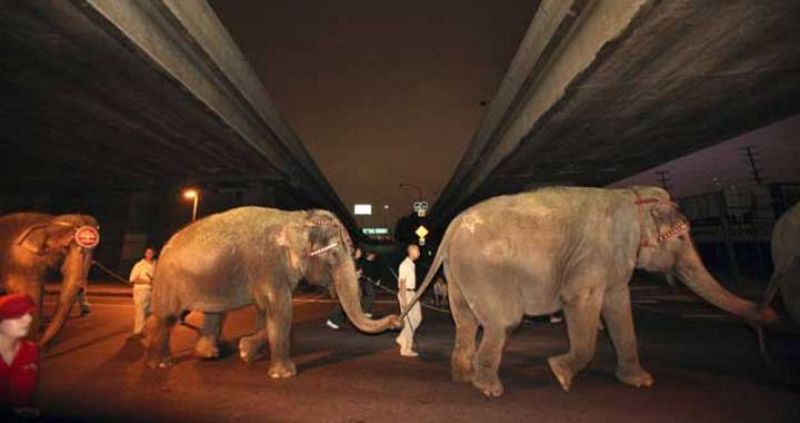 Un insólito desfile ha sorprendido a los neoyorquinos que han trasnochado este lunes. Una manada de elefantes del circo Ringling Brothers Barnum & Bailay recorrió el túnel de Queens Midtown para llegar hasta Madison Square.