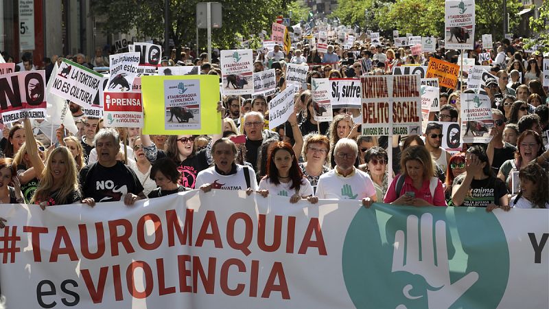 En las calles de Madrid esta mañana han coincidido varias manifestaciones; una organizada por los miles de afectados de Fórum Filatélico y AFINSA, hartos de once años sin solución a sus pérdidas económicas; otra convocatoria callejera reunía en Carabanchel a los vecinos del barrio reivindicando que se alargue o amplíe la línea 11 del Metro; y otra manifestación callejera nos llevará a la Plaza de Ópera, donde los simpatizantes y miembros del Partido Animalista contra el maltrato animal protestaba por las corridas de toros de San Isidro.