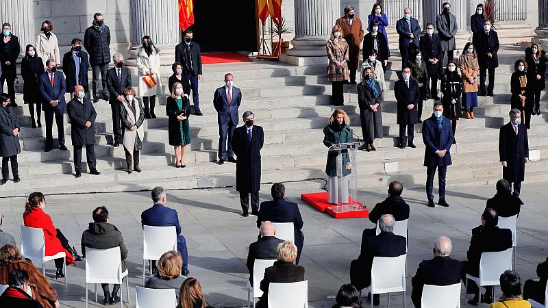 La celebración del Día de la Constitución en el Congreso de los Diputados se ha traducido en escenas de cordialidad entre los políticos, como el saludo del presidente, Pedro Sánchez, con el líder del PP, Pablo Casado, eso sí, fuera de cámara. Sánchez ha reivindicado el cumplimiento de la Carta Magna, mientras que Casado ha cargado contra el "revisionismo" en torno a una reforma de la Constitución. Por su parte, la presidenta del Congreso, Meritxell Batet, ha pedido "lealtad" a la Constitución.