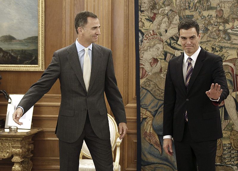 Felipe VI recibe a Pedro Sánchez dos días después de ser ratificado en el congreso que han celebrado los socialistas. Es el primer encuentro entre ambos, en el que seguro abordarán temas como la situación en Cataluña o el futuro del PSOE. El rey le ha preguntado delante de los medios de comunicación por su intensa agenda y el secretario general le ha respondido que merece la pena (29/07/14).