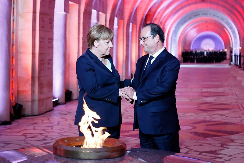 Angela Merkel y François Hollande han escenificado la unidad y reconciliación de Europa en el mismo lugar donde alemanes y franceses combatieron sin descanso durante 10 meses.