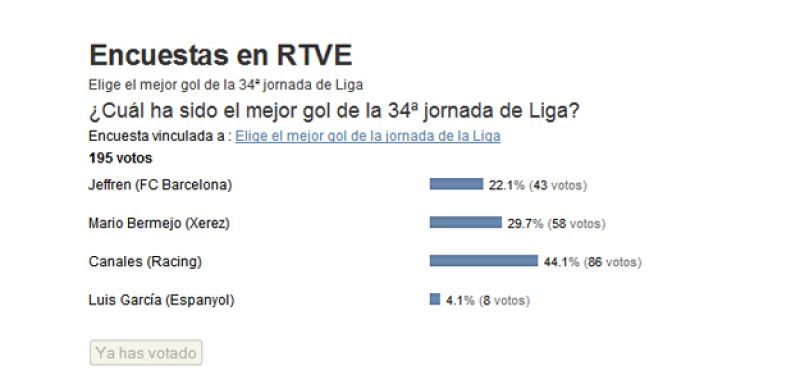 - El delantero del Racing ha sido el más votado con el 44.1 % de los votos