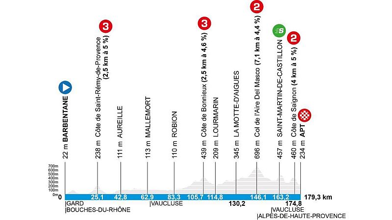 - La sexta jornada es una etapa de media montaña de 179,3 kilómetros y un perfil accidentado, nervioso