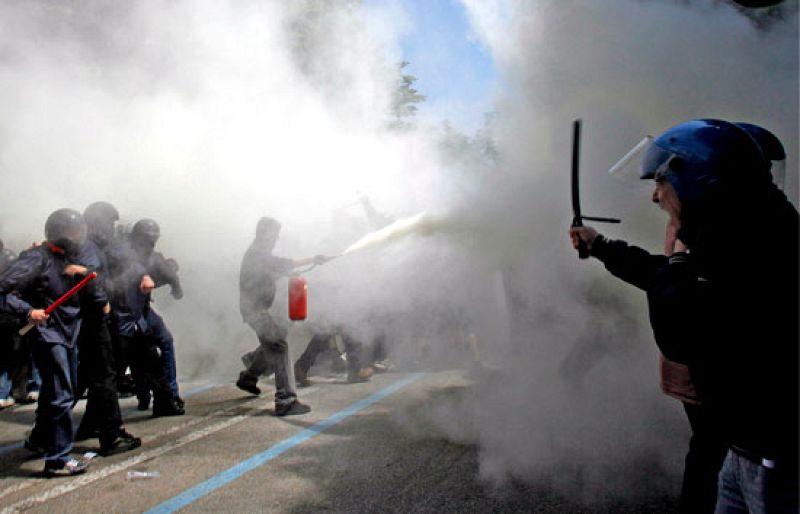 Diecinueve policías han resultado heridos en Turín, en el norte de Italia, en los enfretamientos entre la Policía y miles de estudiantes que protestaban contra la celebración de una reunión de los rectores universitarios previa a una del G8. (19/05/09).