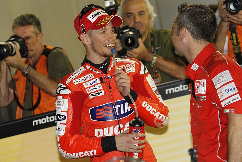 El periodista de RTVE Marc Martín se dirige al piloto de Repsol Honda Dani Pedrosa, en su complicado comienzo de la temporada 2010 (21/04/2010).