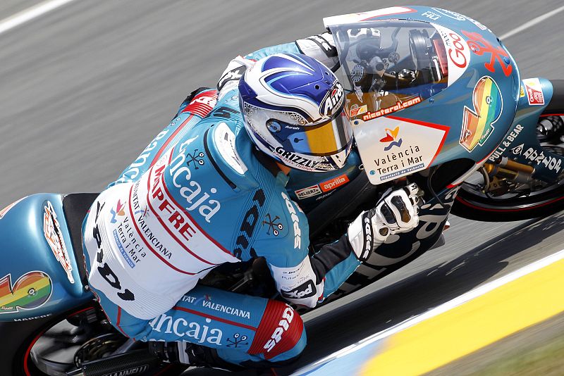 El piloto de 125cc Pol Espargaró ha marcado el mejor tiempo en los primeros entrenamientos libres del Gran Premio de Francia. Marc Márquez fue segundo (21/05/2010).
