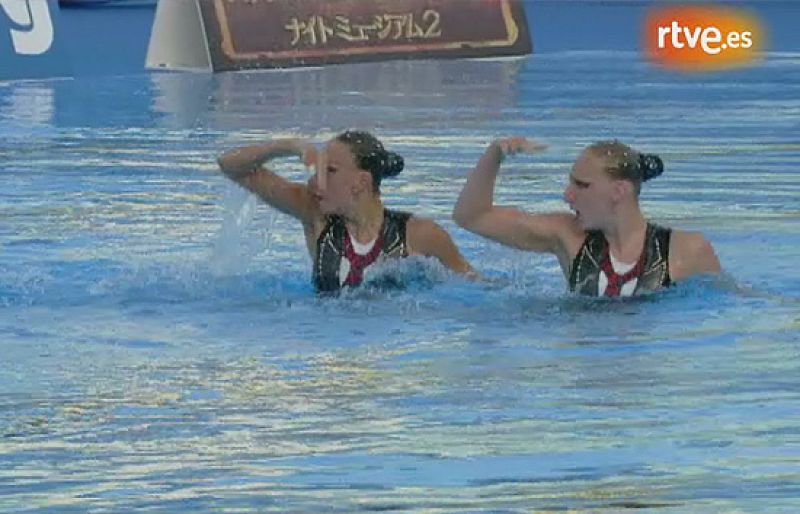 Gemma Mengual y Andrea Fuentes han conseguido una nueva medalla de plata en la modalidad de duo libre. La pareja española se quedó a sólo medio punto de las rusas (24/07/09).