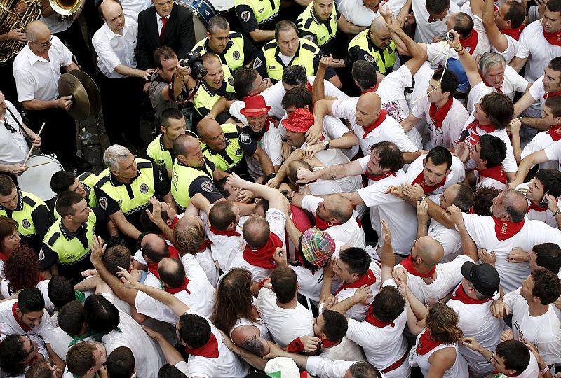 Las Fiestas de San Fermín han comenzado hoy en Pamplona con el multitudinario chupinazo, pero sin poder cumplir uno de los objetivos que se había propuesto el alcalde, la recuperación del Riau riau, que se ha suspendido por los incidentes causados por un grupo de personas en la plaza del Ayuntamiento.