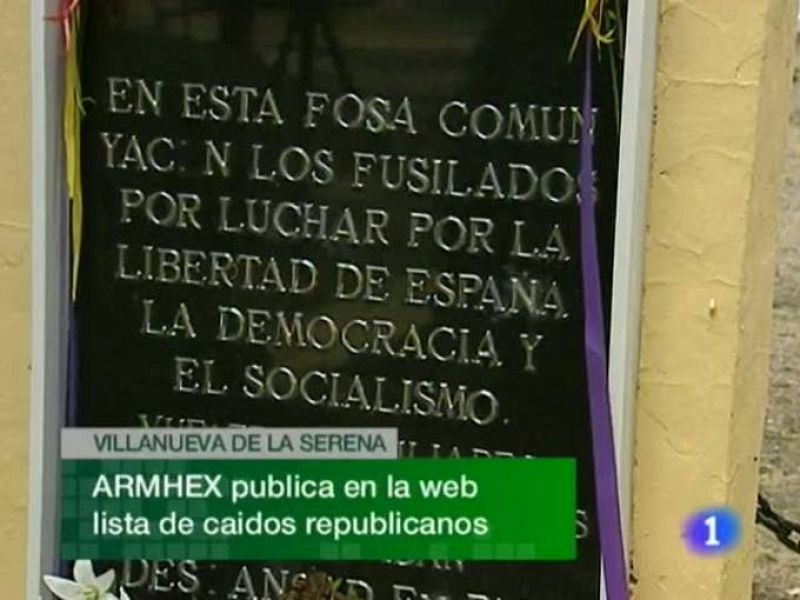 La Asociación para la recuperación de la Memoria Histórica de Extremadura ha publicado en su página web un listado provisional con las más de 590 personas que según el colectivo sufrieron la represión franquista en Villanueva de la Serena...Extremadurareutiliza.es es la nueva web que la Junta de Extremadura pone a disposición de todos los ciudadanos... La escuela de la construcción ya está en marcha en Cáceres... En San Vicente de Alcántara, la asociación de disminuidos rentabiliza el reciclaje de los tapones de corcho. (12/01/11)