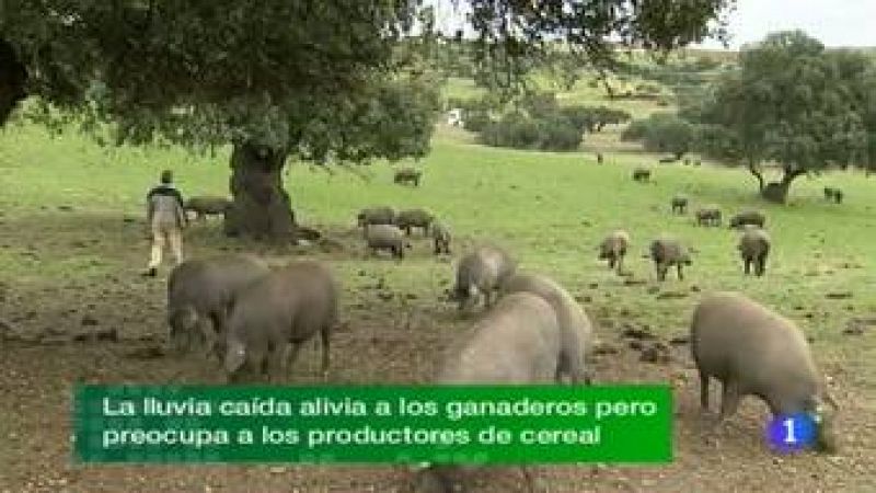 Satisfacción en el sector agroganadero de la región por las últimas y abundantes lluvias. Todo un alivio para el bolsillo de los ganaderos. Al cereal, en plena siembra, también le viene bien la lluvia pero no en exceso porque puede mermar la producción. El presidente de la Junta descarta formar parte del nuevo gobierno de Mariano Rajoy. La Junta autoriza 65 parques eólicos; junto a los que ya autorizó el anterior ejecutivo son ya más de 100 los previstos en la región. Falta justo un mes para el Sorteo Extraordinario de la Lotería de Navidad; los extremeños gastaremos de media 56 euros, 10 euros más que en 2010. Nuevo tesoro arqueológico en Mérida; acaban de recuperar las termas públicas más antiguas y las mejor conservadas de la ciudad. (22/11/11)