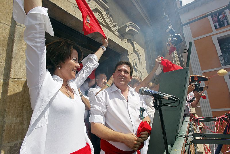 Mari Ganuza, presidente de la Comparsa Gigantes y Cabezudos, que cumple 150 años, ha sido el encargado de lanzar el cohete que abre las fiestas de San Fermín. Ganuza ha usado la doble fórmula en español y en euskera para dar inicio a las fiestas: 'Pamploneses, pamplonesas, ¡viva San Fermín!; Iruñatarrak, ¡gora San Fermín!'