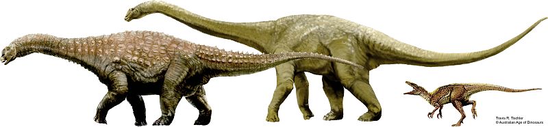 - Se trata de un terópodo carnívoro y dos gigantescos saurópodos vegetarianos