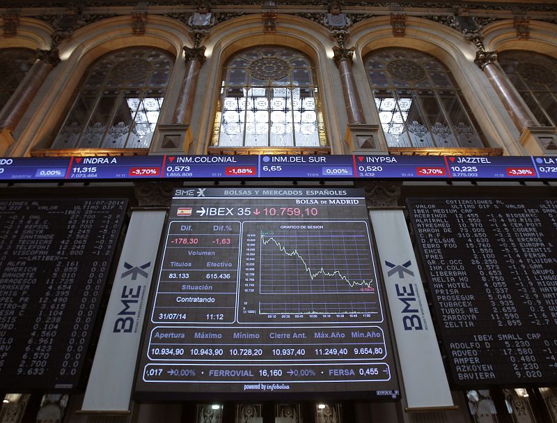 El IBEX 35 se ha dejado un 1,8% en la sesión y ha cerrado la semana con un retroceso del 3,44%. Solo IAG ha escapado del rojo con una subida del 1,62% tras salir de pérdidas en el primer semestre. A unos resultados empresariales peores de lo esperado, según los expertos, se ha sumado la suspensión de pagos de Argentina. Finalmente, la puntilla ha venido de Portugal. El Banco Espírito Santo ha sido suspendido de cotización a media tarde tras desplomarse por segundo día consecutivo más de un 40%.