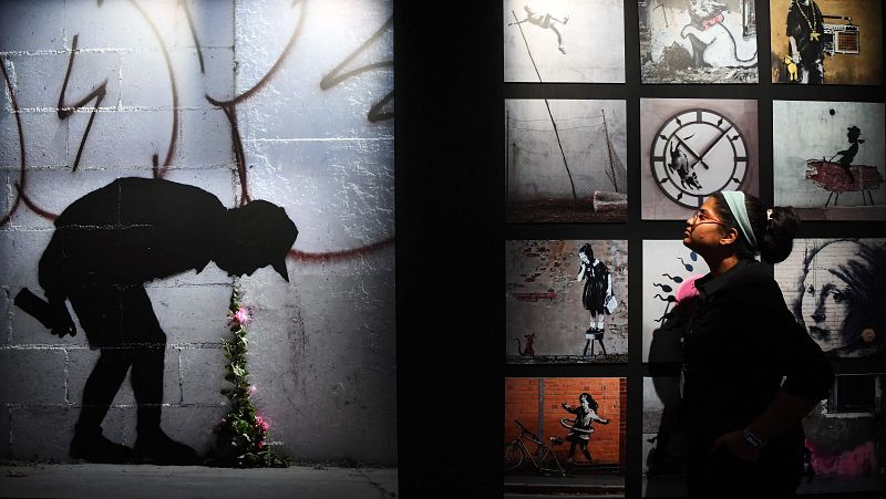 - Entre las obras que se exponen están "Girl With Balloon" (Niña con globo) o "Kissing Coppers" (Policías besándose)