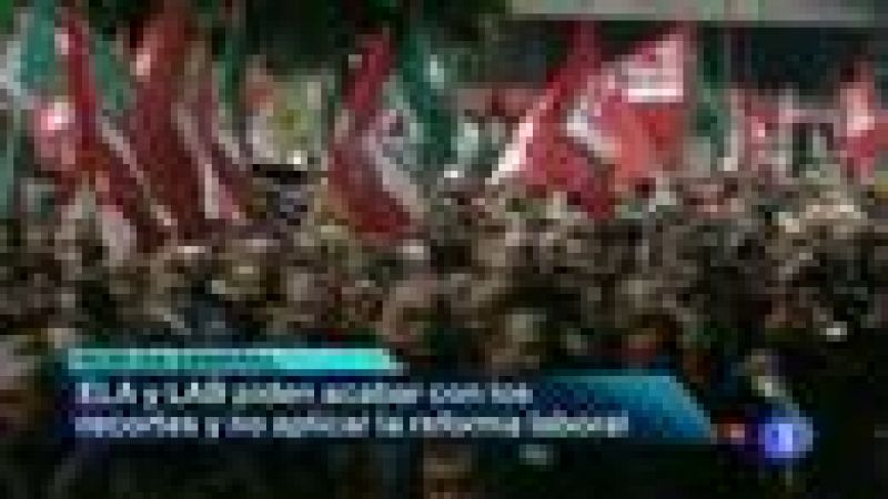 Normalidad e incidentes aislados en la huelga general convocada para hoy por los sindicatos nacionalistas. Los secretarios generales de ELA y LAB han participado en la manisfestación celebrada este mediodía en Vitoria.//El Gobierno Vasco cifra en un 20 por ciento el seguimiento de la huelga en el sector público; cinco puntos menos que el pasado 26 de Septiembre, jornada de paro convocada también por los sindicatos nacionalistas.// La imaginación puesta al servicio de la creatividad. El resultado es: "El Sol", el Festival Iberoamericano de la Publicidad, cuya edición número 28 ha arrancado esta mañana en Bilbao.(30/05/13)